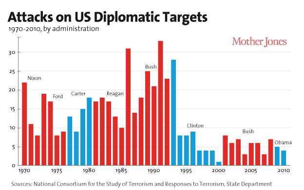 As horrible as the attack was on the U.S. embassy in Benghazi, Lybia, it was not the first time a U.S. embassy has been attacked resulting in the loss of American lives. If you don’t know history or only listen to Republicans, who have shamefully politicized this incident due to election 2012 and their hatred for President Obama, you would be fooled into thinking that our embassies have never before been attacked, breached or otherwise endangered. Or that this incident would not have happened under a Republican administration. Not so. This article by Adam Serwer of Mother Jones sheds light on the Benghazi attack and places it into its historical context. For the last 40 years since the Nixon administration, U.S. embassies and diplomats have been targets regardless of which political party occupied the White House.