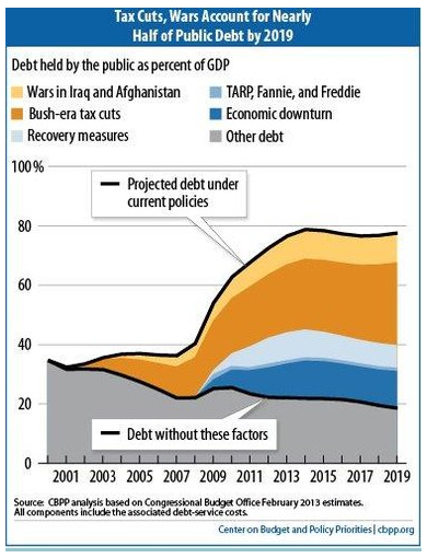As it pertains to revenues, Ryan’s budget collects the same amount of revenue as projected by CBO over the next 10 years. Ryan’s budget repeals ObamaCare tax revenues that pay for insurance subsidies, but it still relies on its revenue for his budget. How is this possible? Ryan indicates that tax reform will replace this revenue. The budget relies heavily on the hope that Congress will complete tax reform by 2014. Tax reform GOP style proposes two tax rates at 10% and 25%, repeal of the alternative minimum tax, lowering of the top corporate rate to 25% and changes the rules for international taxation. Fantasy!